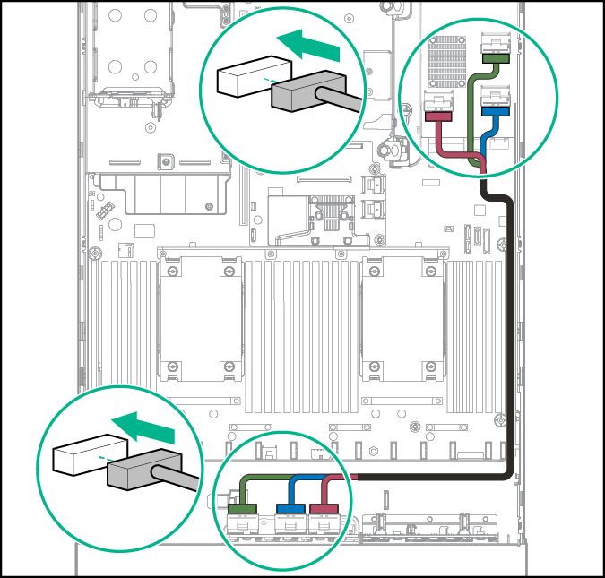 14ـ با استفاده از کابل ها و کلیپس ها ، کابل داده NVMe) 826898-001) را به HPE Express Bay Bridge Card وصل کنید. اگر کارت HPE 12G SAS Expander Card نصب شده باشد، 12G SAS expander card cable) 776402-001) را متصل نمایید.